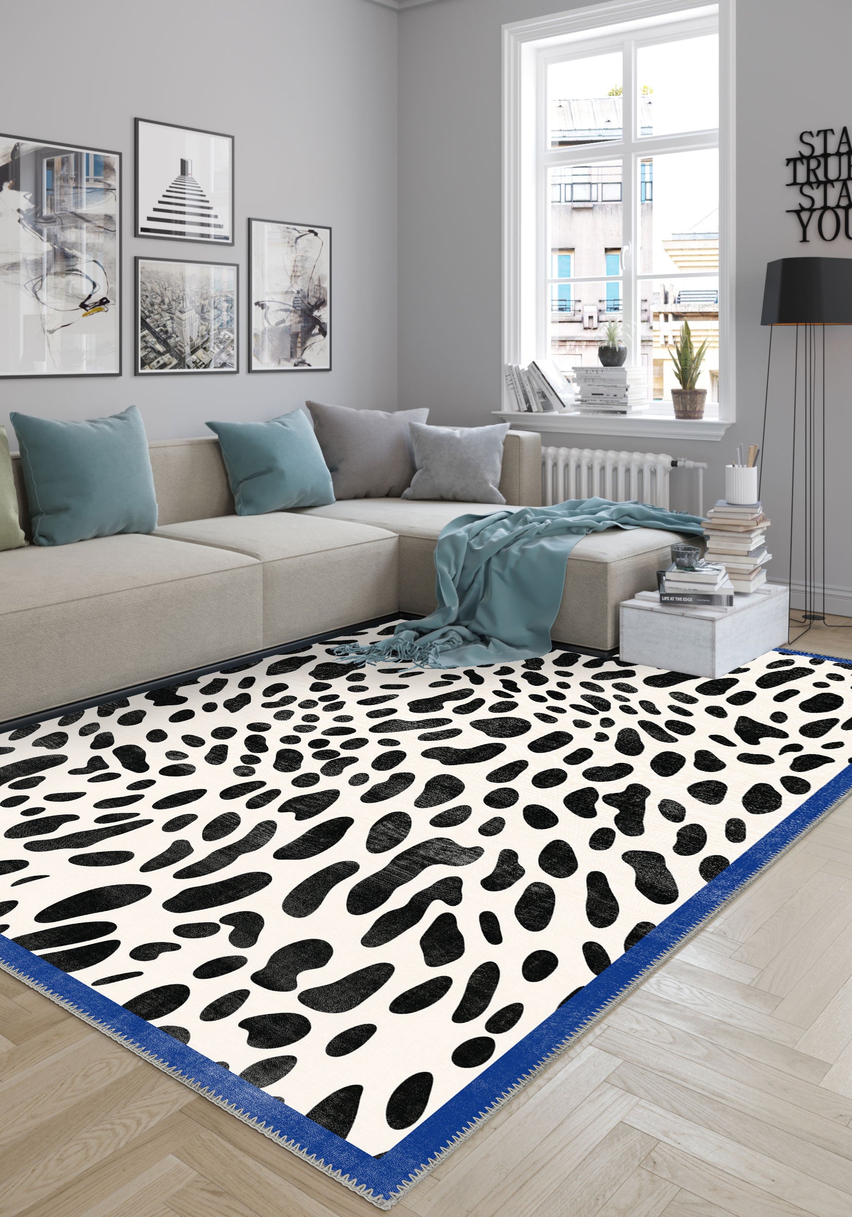 - Scandinavian: In a Scandinavian-style home, the neutral tones of the Dalmatian spots combined with the bold blue border introduce warmth and visual interest without overwhelming the simplicity of the space.