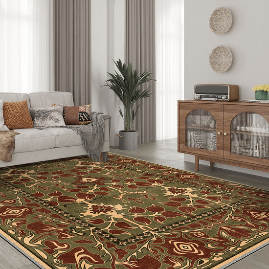 The Sylvara Vintage Green Rug feels like stepping into a romantic English garden touched by heritage craftsmanship. With its rich olive-green base and flowing rust-toned botanical motifs, this vintage green rug carries the quiet confidence of antique design while fitting effortlessly into modern homes.