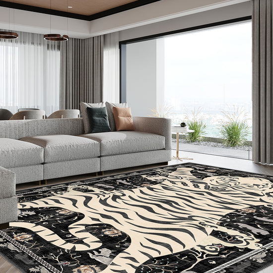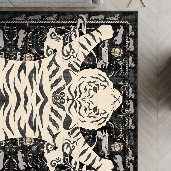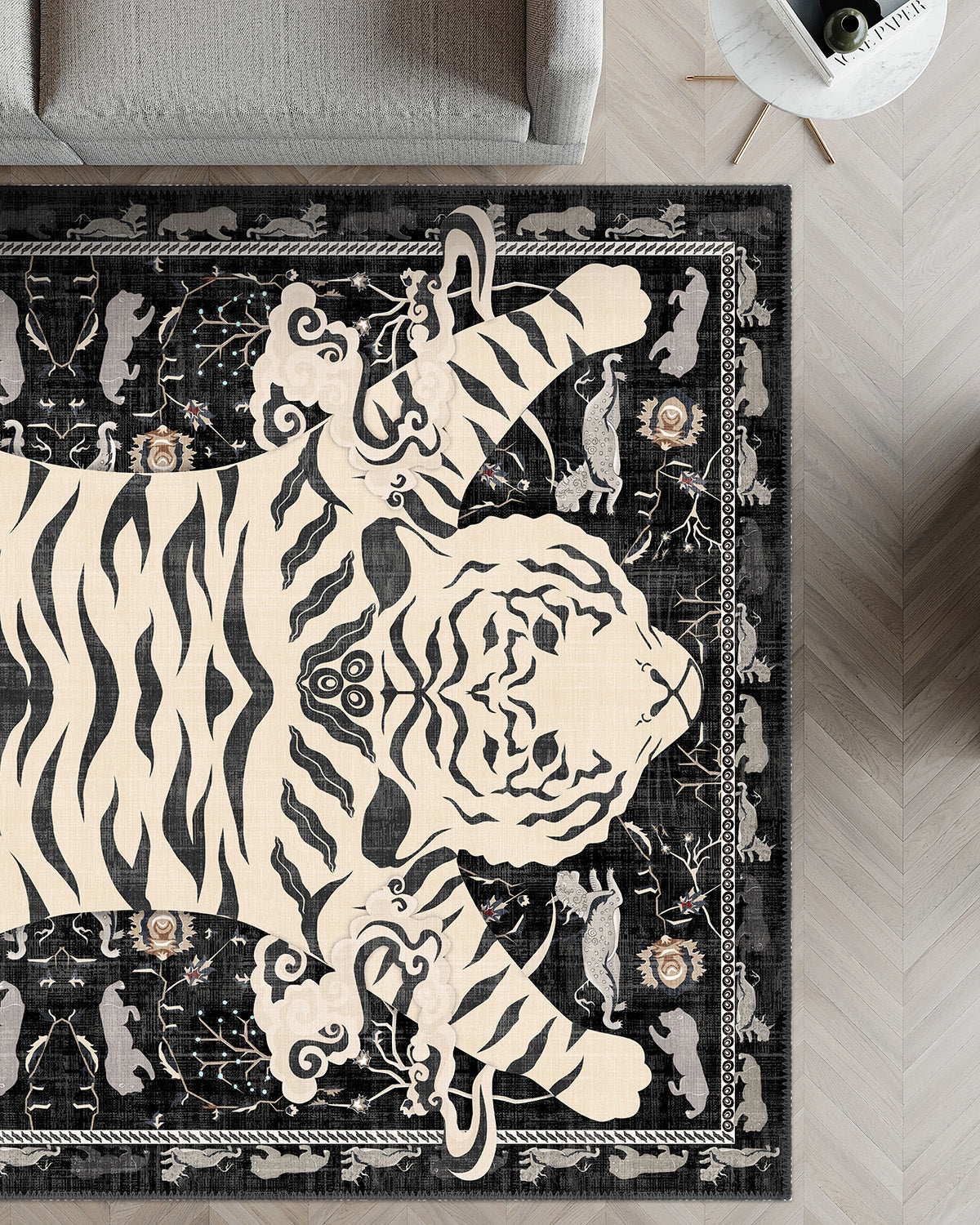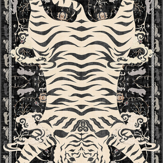The Tashi Black and White Tiger Pelt Rug is a bold reinterpretation of traditional Tibetan tiger rugs, reimagined for the modern home. With its commanding tiger pelt silhouette stretched across a richly illustrated black backdrop, this rug fuses heritage symbolism with contemporary graphic flair. From its mystical border of crawling panthers and ancient cloud motifs to the watchful eyes hidden in its symmetrical frame, every inch tells a story of power, guardianship, and sacred design.