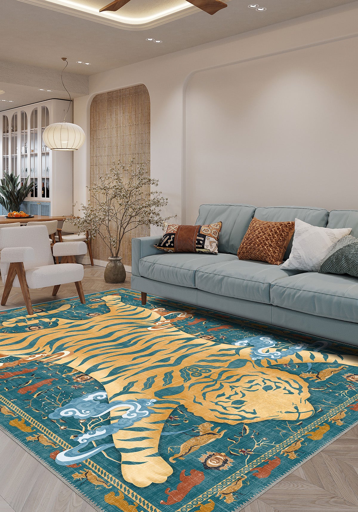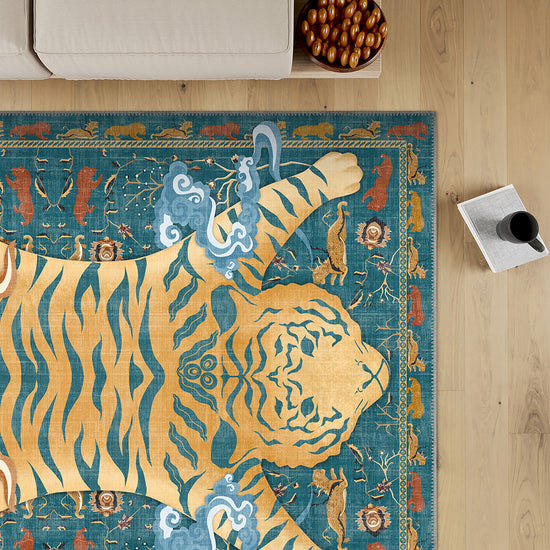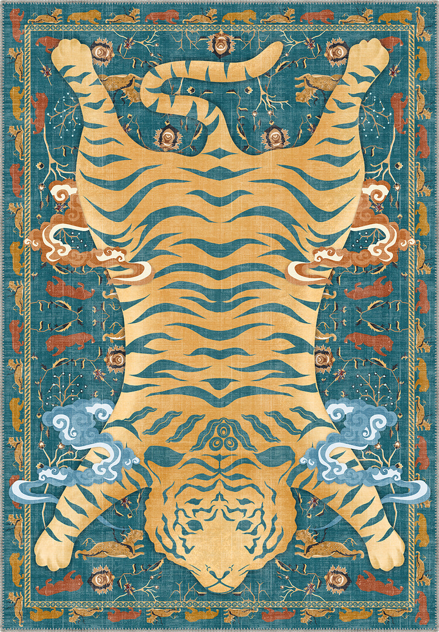- Bold and intricate Tibetan tiger motif set against a deep teal ground
