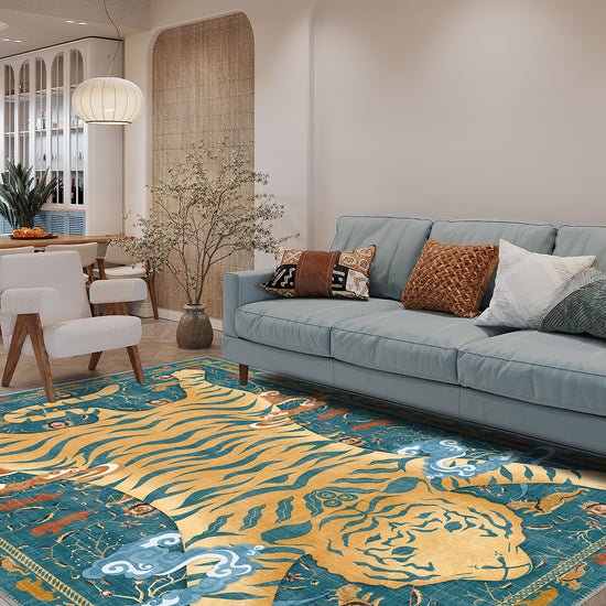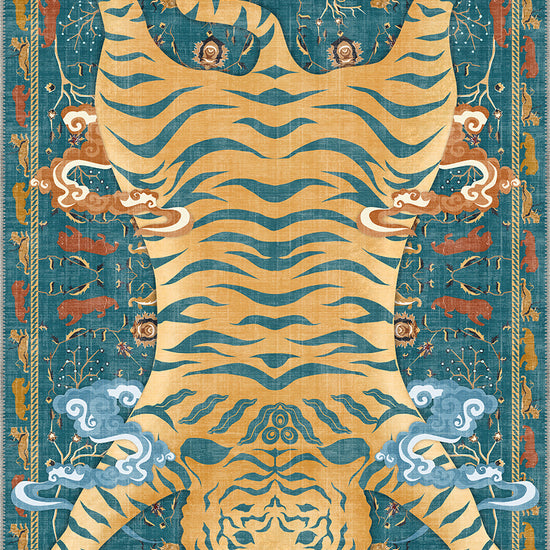 The Tashi Tibetan Tiger Asiatic Rug brings fierce symbolism and rich colour together in a masterpiece that honours traditional Himalayan art. A radiant golden tiger stretches across a deep teal field, surrounded by ancient clouds, floral guardians, and mythic beasts—all drawn in the detailed style of classic Asiatic rugs. This design, rooted in the legacy of Tibetan tiger pelts, represents spiritual power, protection, and the untamed energy of the natural world.