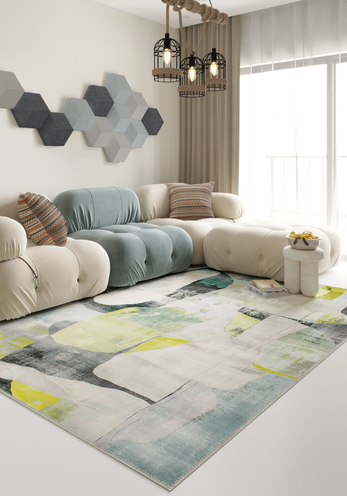 - Abstract Art Inspiration: This rug’s abstract shapes and layers of textured colour give it the appearance of a modern painting, creating a sense of movement and depth.