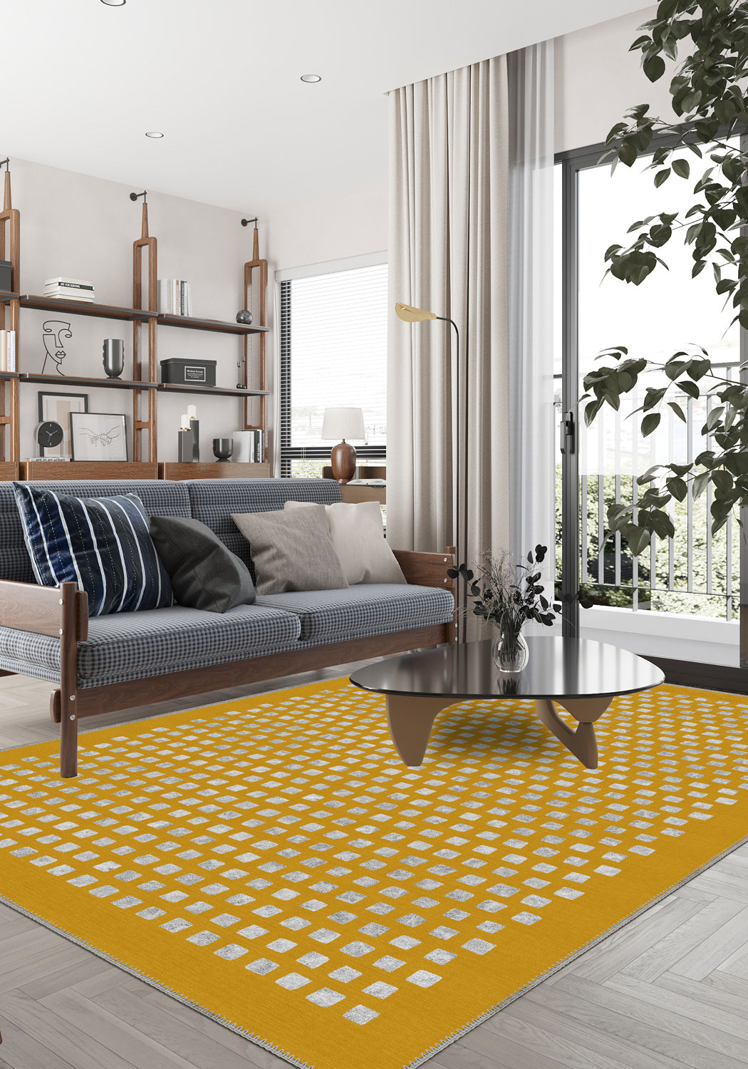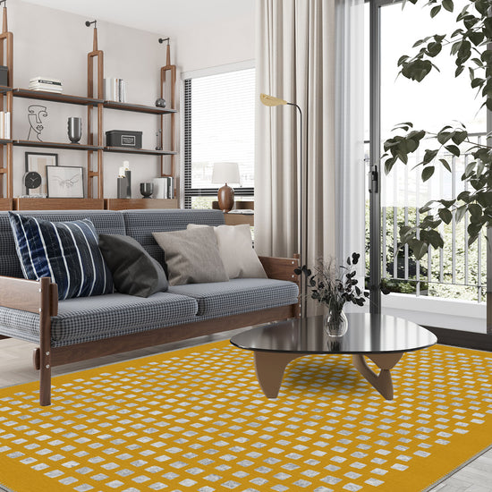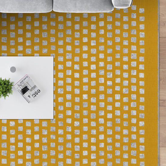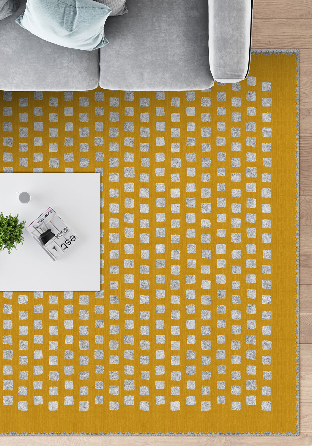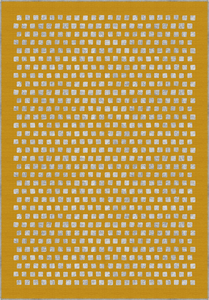 The Thalia Geometric Yellow Rug radiates joy and clarity in equal measure. With its warm mustard-yellow base and silvery rectangular brushstrokes, it balances playful energy with graphic precision. The hand-painted texture of each shape adds softness, while the rhythmic grid keeps things clean and crisp. It’s modern, optimistic, and effortlessly fun—just what a sunny space needs.