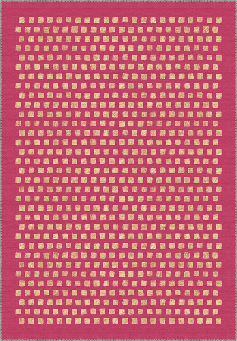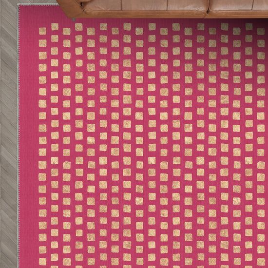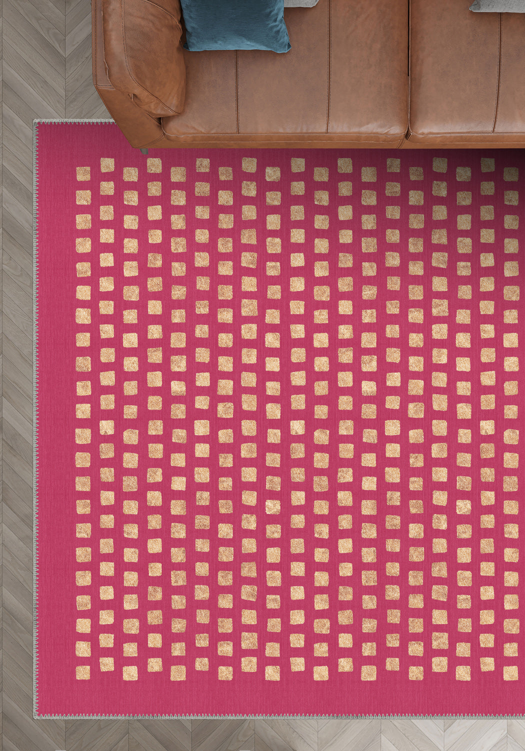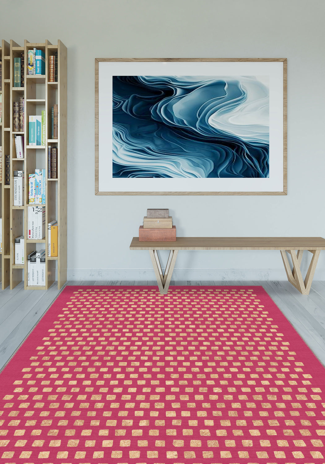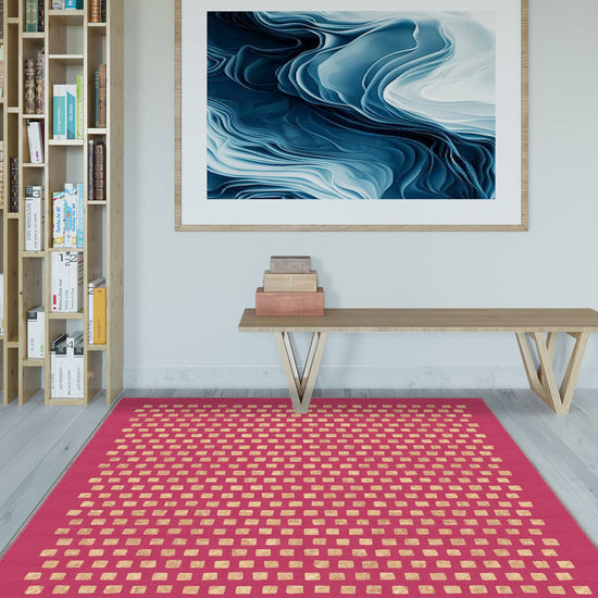The Thalia Modern Pink Rug is pure joy in design form. With its radiant raspberry-pink backdrop and grid of painterly golden rectangles, it offers a playful take on geometric minimalism. The result is striking yet soft—every brush-like mark adding movement, texture, and a warm contemporary glow. This is a rug that makes the room smile, instantly.