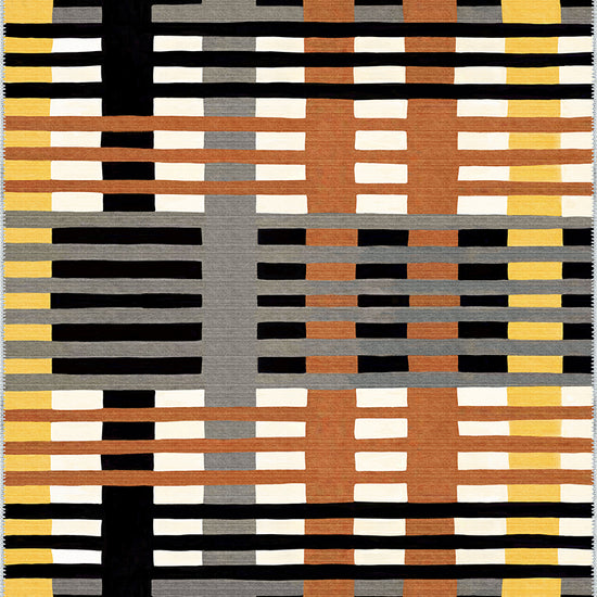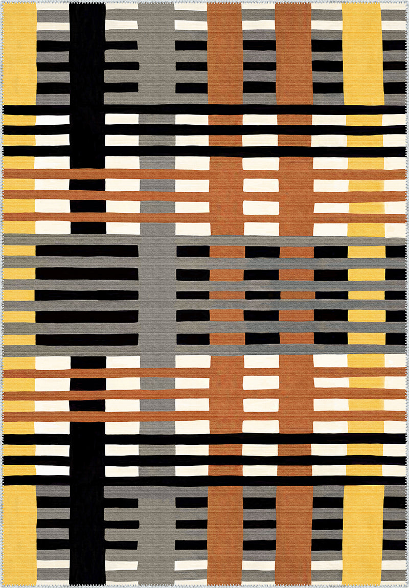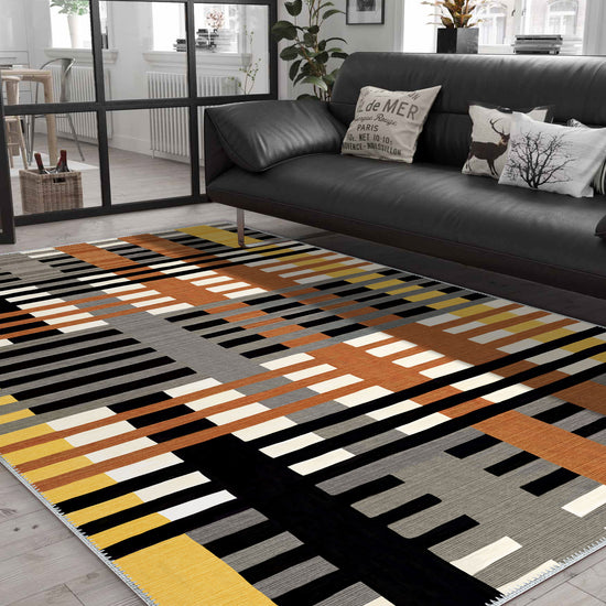 Inject a dose of bold, contemporary style into your home with the Vesper Striped Washable Rug. This striking rug features a unique striped design with a captivating mix of earthy tones like black, grey, orange, and mustard. Ideal for modern interiors, the Vesper rug will become the centerpiece of any room while offering practicality with its washable construction.