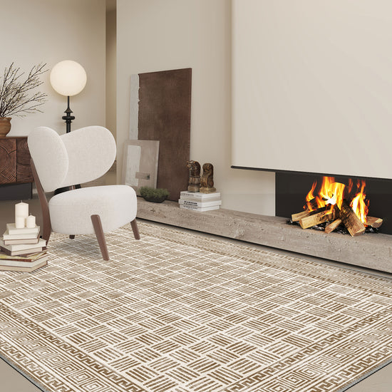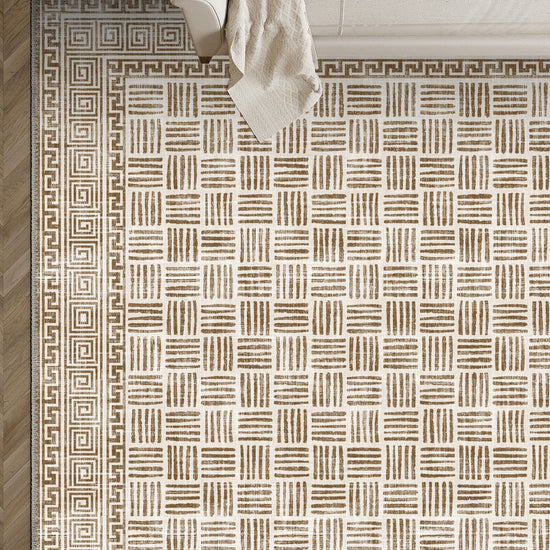 The Vincent Geometric Sand Rug is understated sophistication at its finest. With its warm sand base and rhythmic geometric pattern framed by a structured Greek key border, this design feels curated, balanced, and quietly powerful.