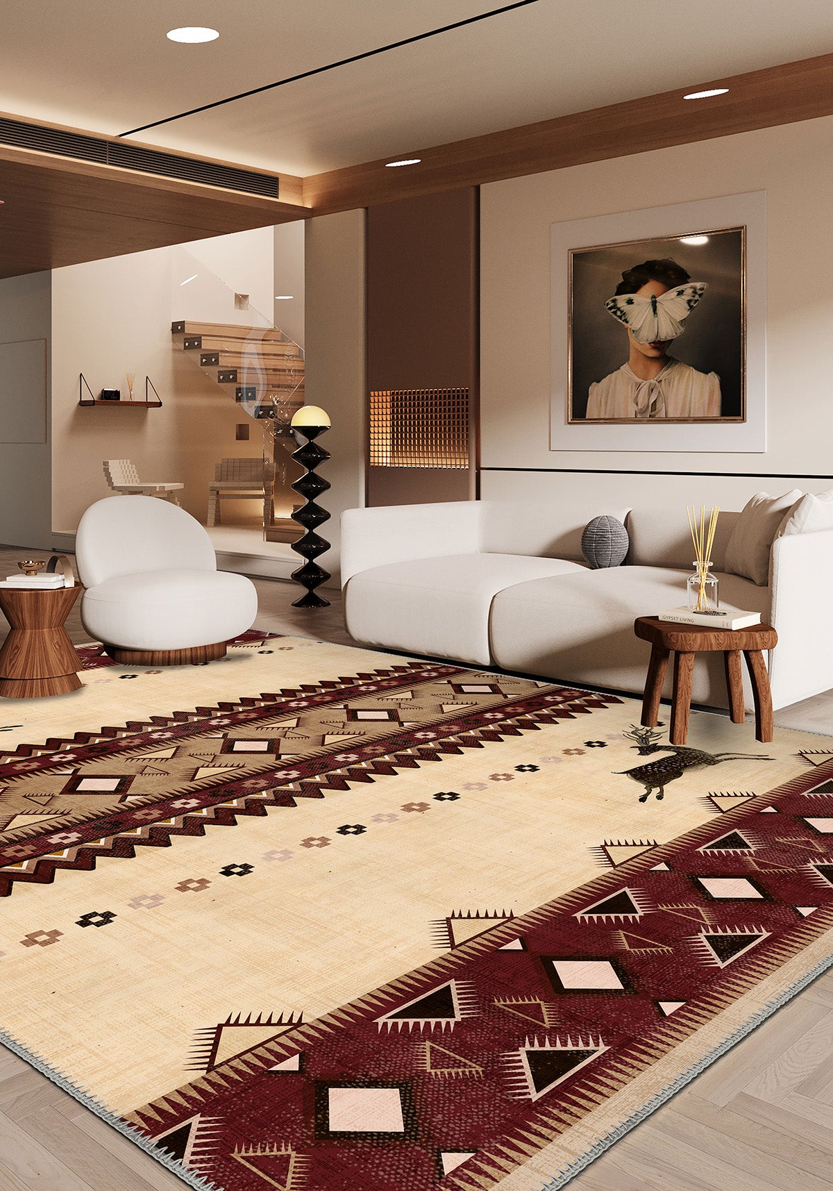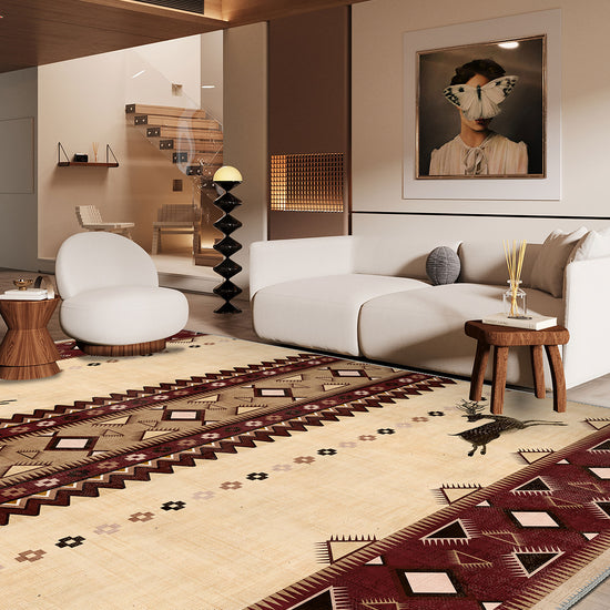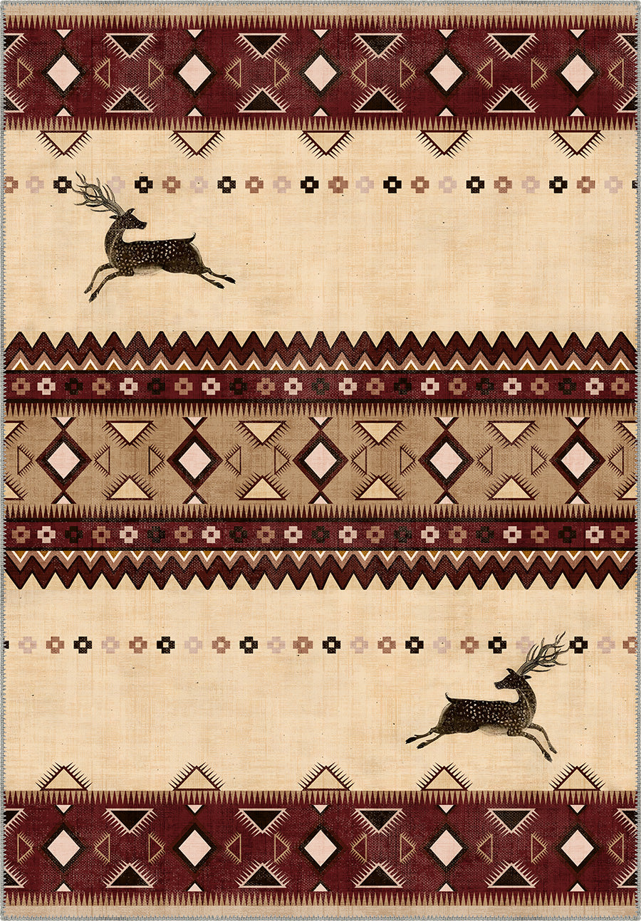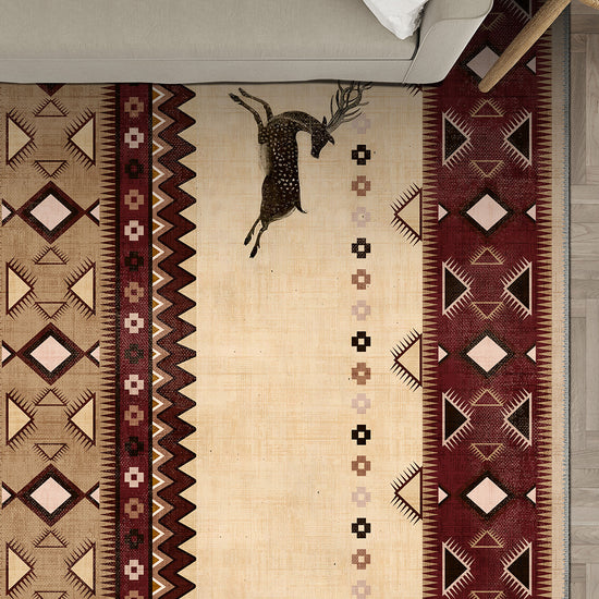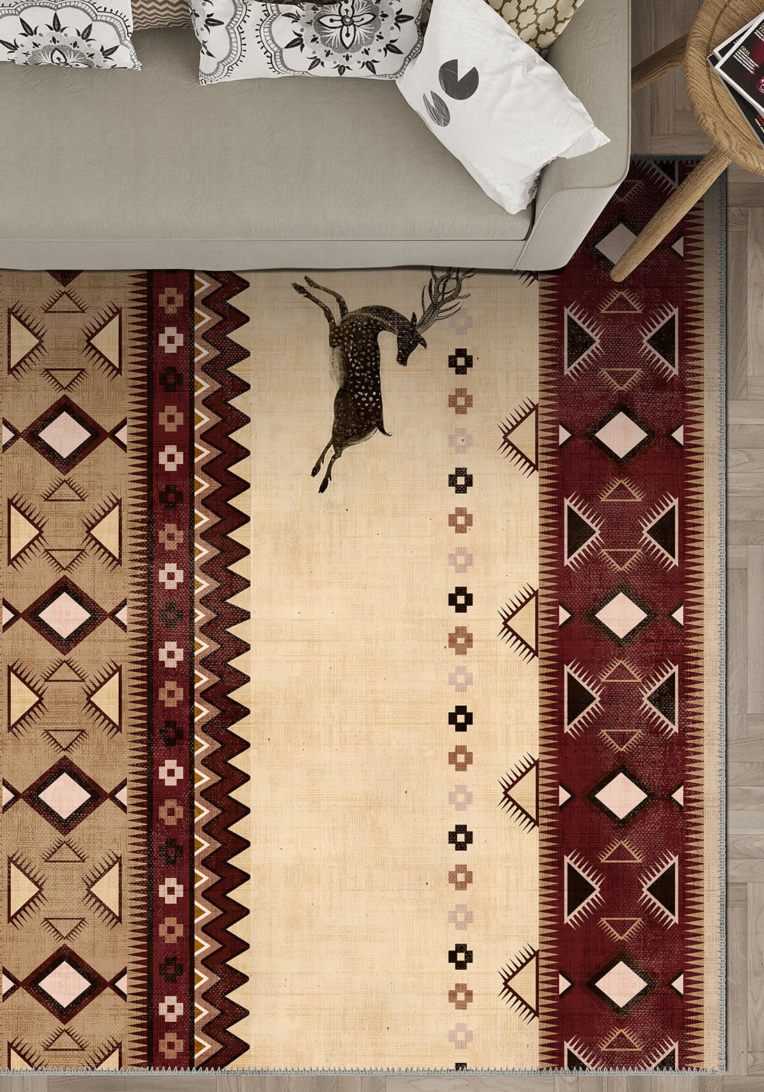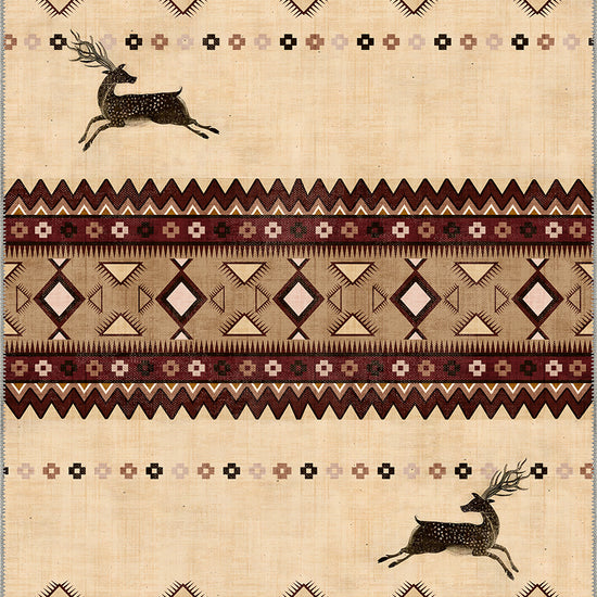 The Wildwood Reindeer Rustic Rug is pure folklore underfoot. With a soft oatmeal base and intricate tribal borders in deep burgundy, it conjures the feeling of an alpine lodge at dusk. Playful reindeer leap across the rug’s centre, framed by motifs that feel both ancient and heartwarmingly familiar. It's more than a rug—it's a winter tale, woven in threads of nostalgia and warmth.