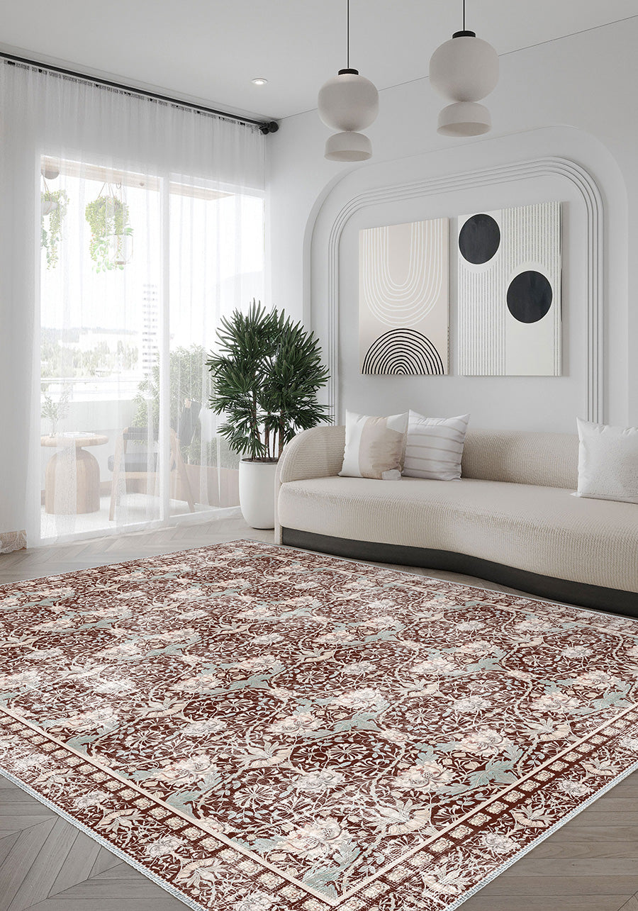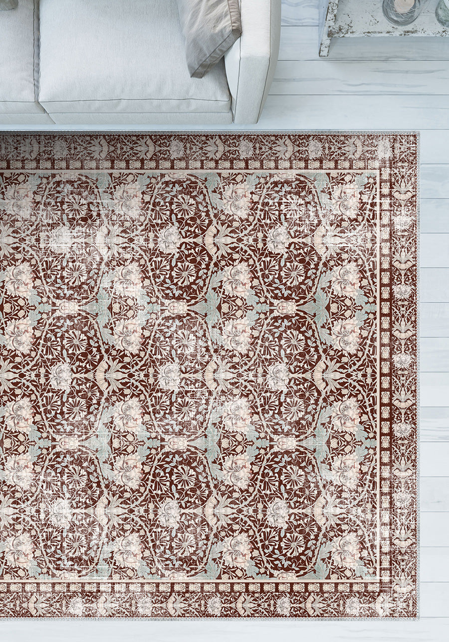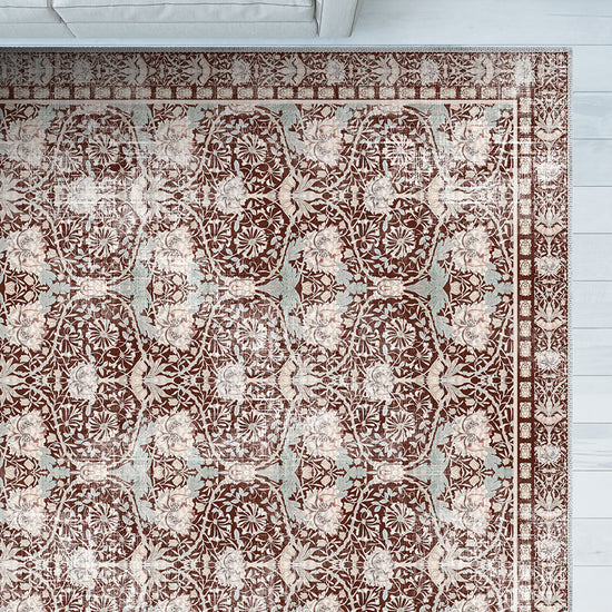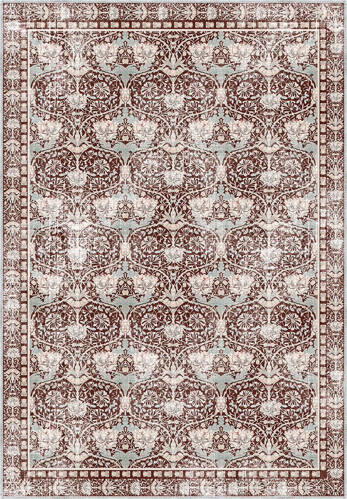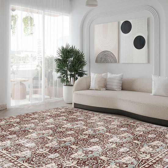 The Zachary Burgundy Art Nouveau Rug is a masterpiece of design, showcasing intricate floral patterns inspired by the Art Nouveau era. Featuring rich burgundy tones complemented by subtle aqua and beige accents, this rug brings sophistication and artistry to your home décor.