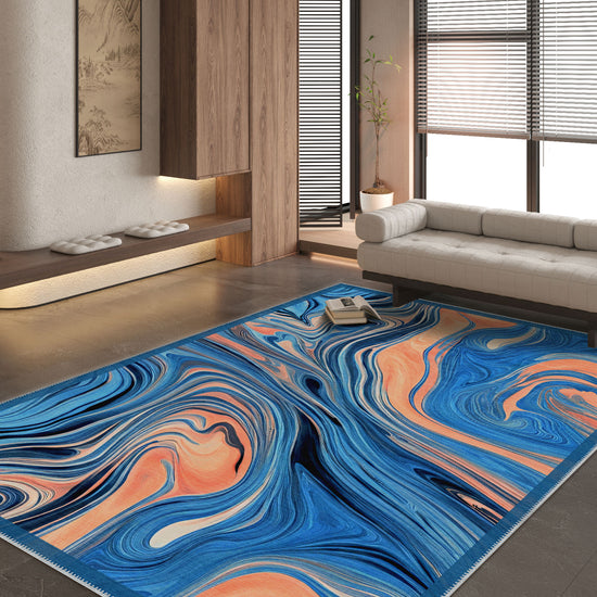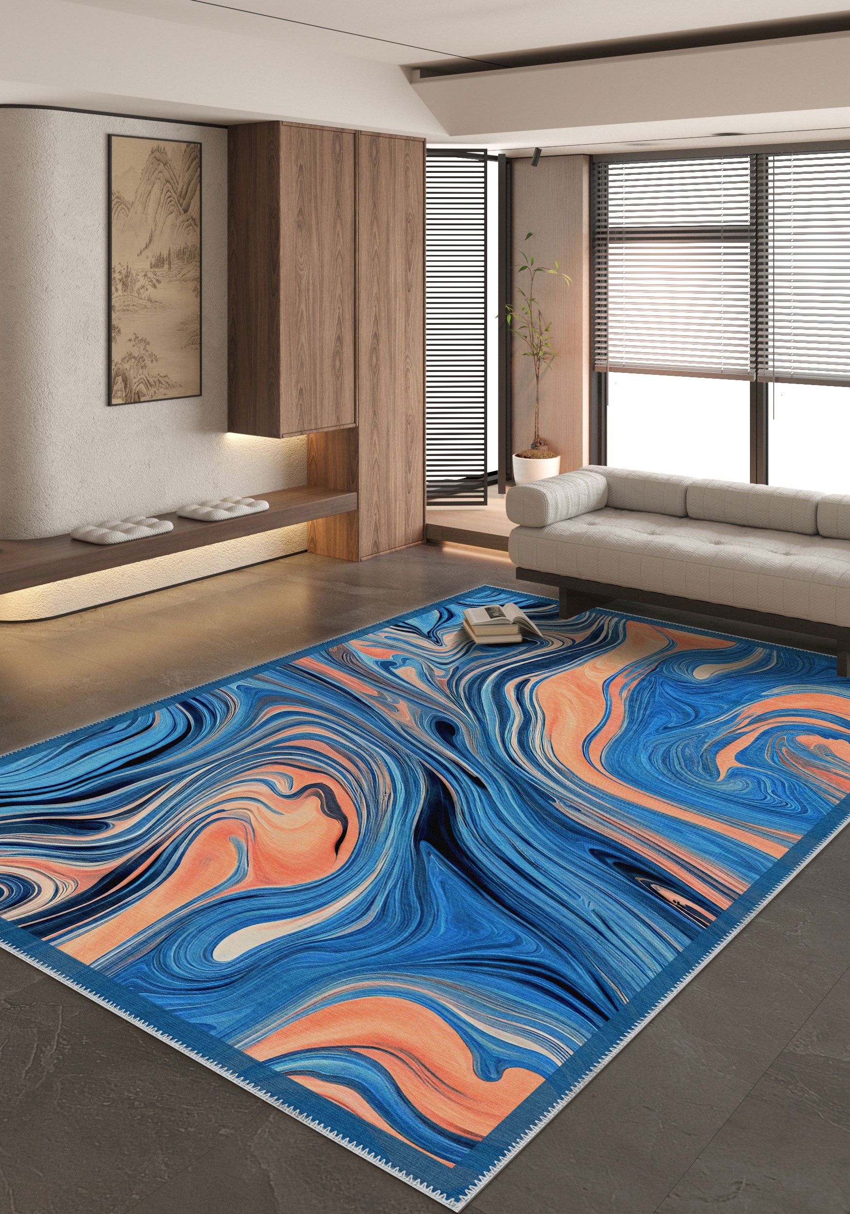 - Bold Abstract Design: The Zane rug features sweeping, fluid patterns in rich blues and contrasting orange hues, creating a dynamic look that invigorates any interior.