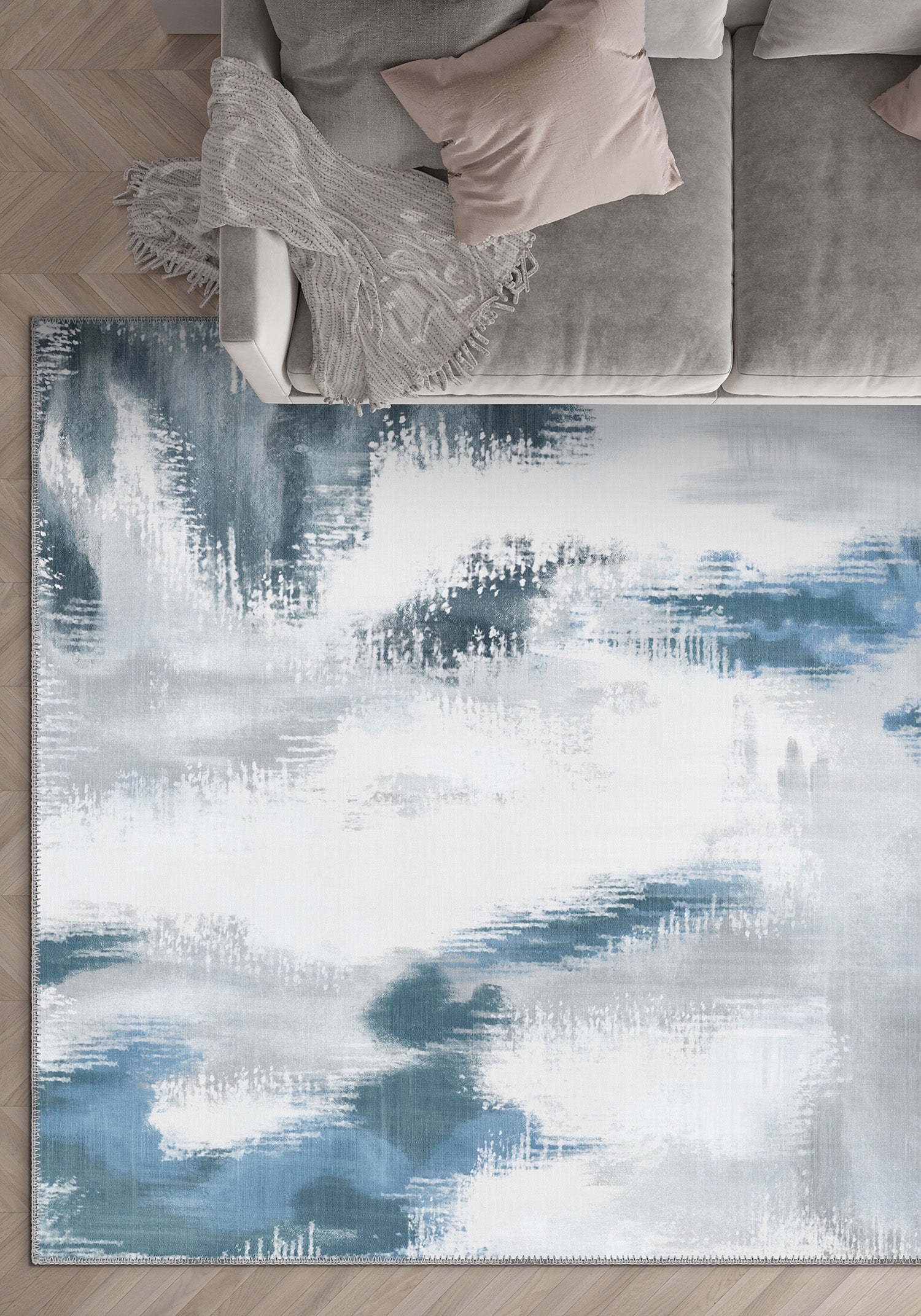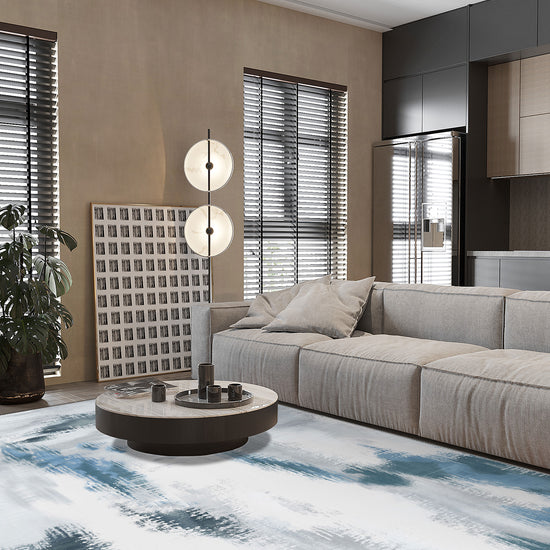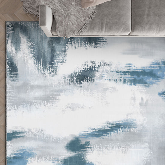 The Zarina Grey Blue Ikat Rug is where contemporary calm meets artistic flow. Soft tonal greys are gently interrupted by waves of inky blue and off-white, evoking the quiet rhythm of a misty seascape. The ikat-inspired strokes are fluid and modern—perfect for spaces that lean into minimalism but still crave depth and texture.