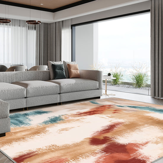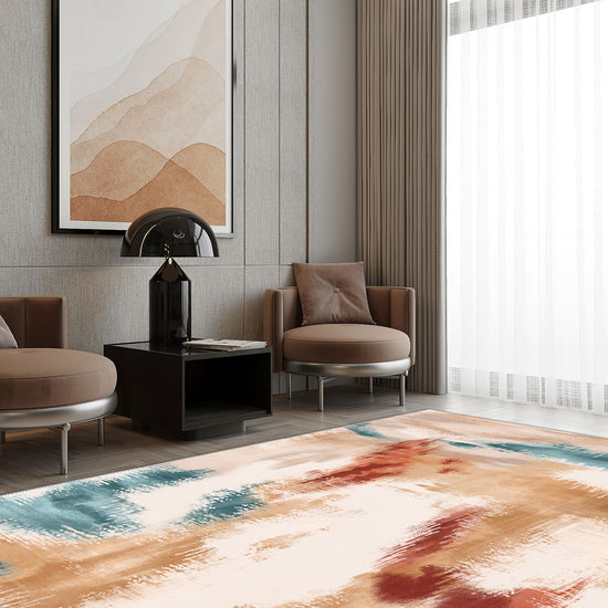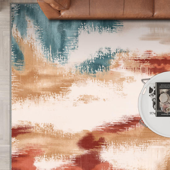 Inspired by traditional ikat weaving but reimagined in a free-flowing, watercolour-like form, the Zarina Terracotta Ikat Rug is a dreamscape of warm tones and expressive movement. Terracotta reds, golden sands, and sea-glass teal blend across its surface with painterly softness, offering both grounding warmth and artistic freedom. It feels like a sunset melting into a canvas.
